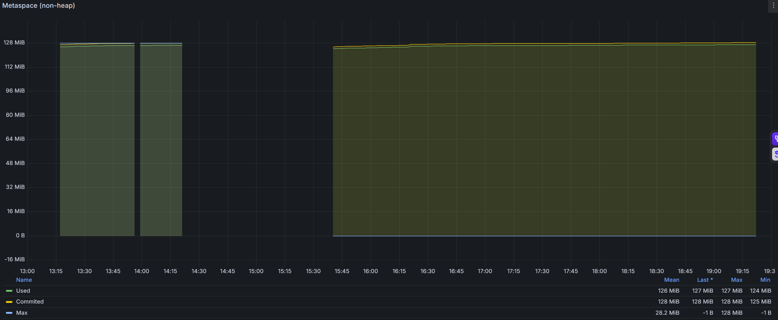 트래픽 문제로 발생한 장애가 아니라, 시작부터 이미 Metaspace 한도를 거의 사용한 상태였고 클래스가 조금씩 로드되면서 대회 시작 1시간만에 꽉 차버린 것이다.