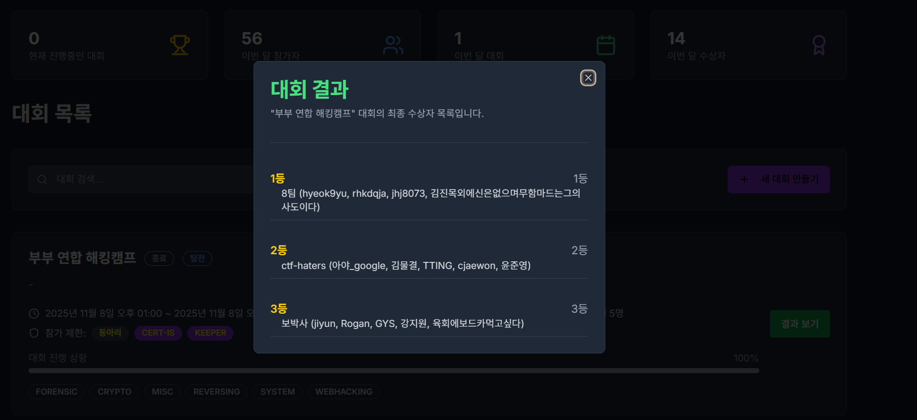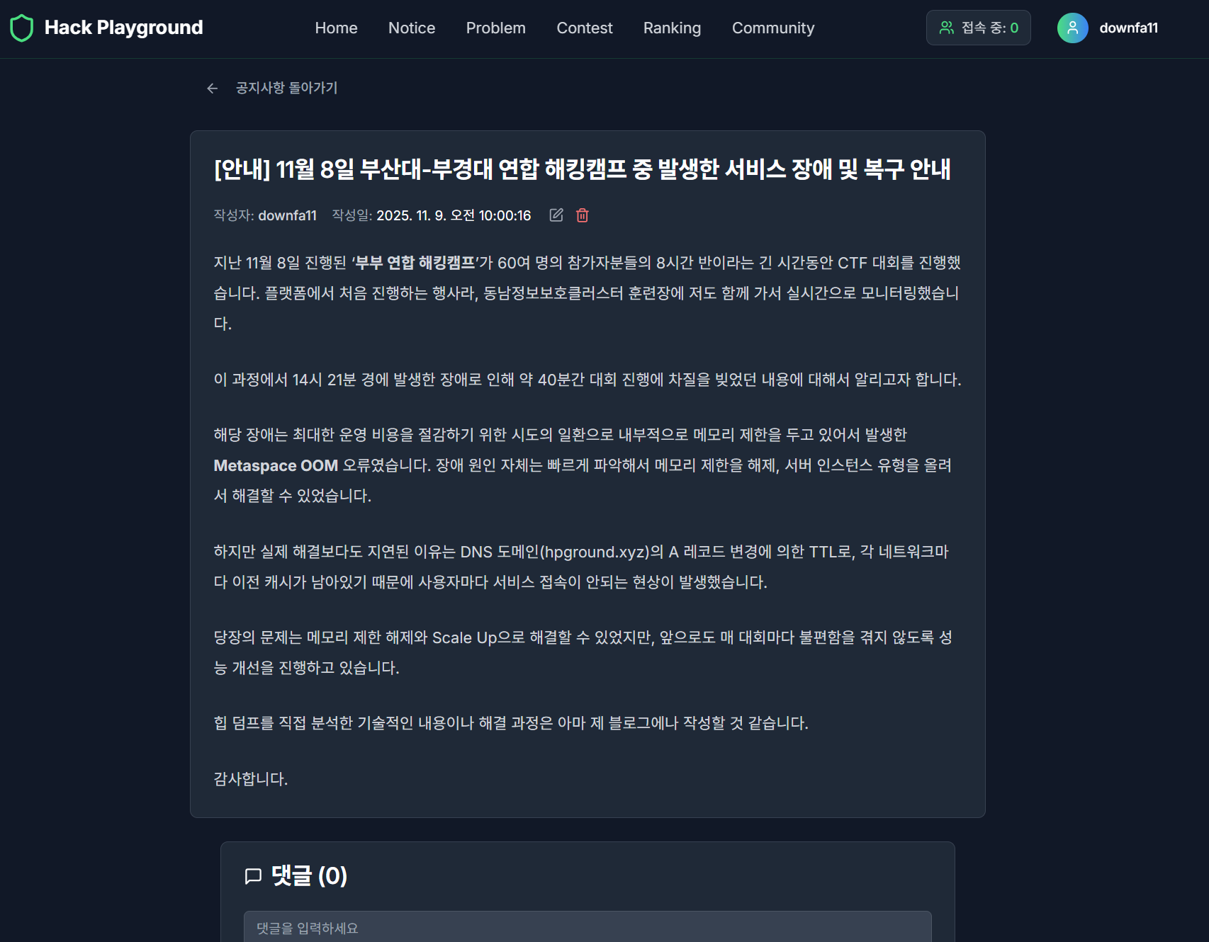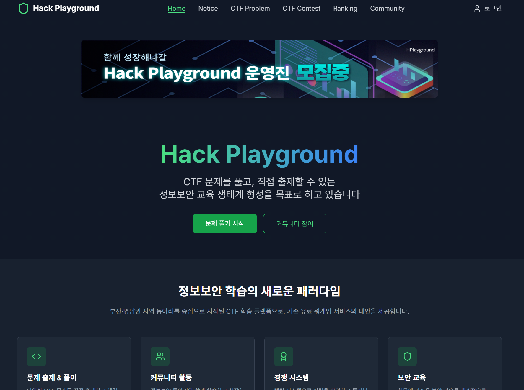 11월 8일자로 진행된 부산대-부경대 연합 해킹캠프에서 'Hack-Playground' 서비스 내의 CTF 대회를 시범적으로 도입했다.