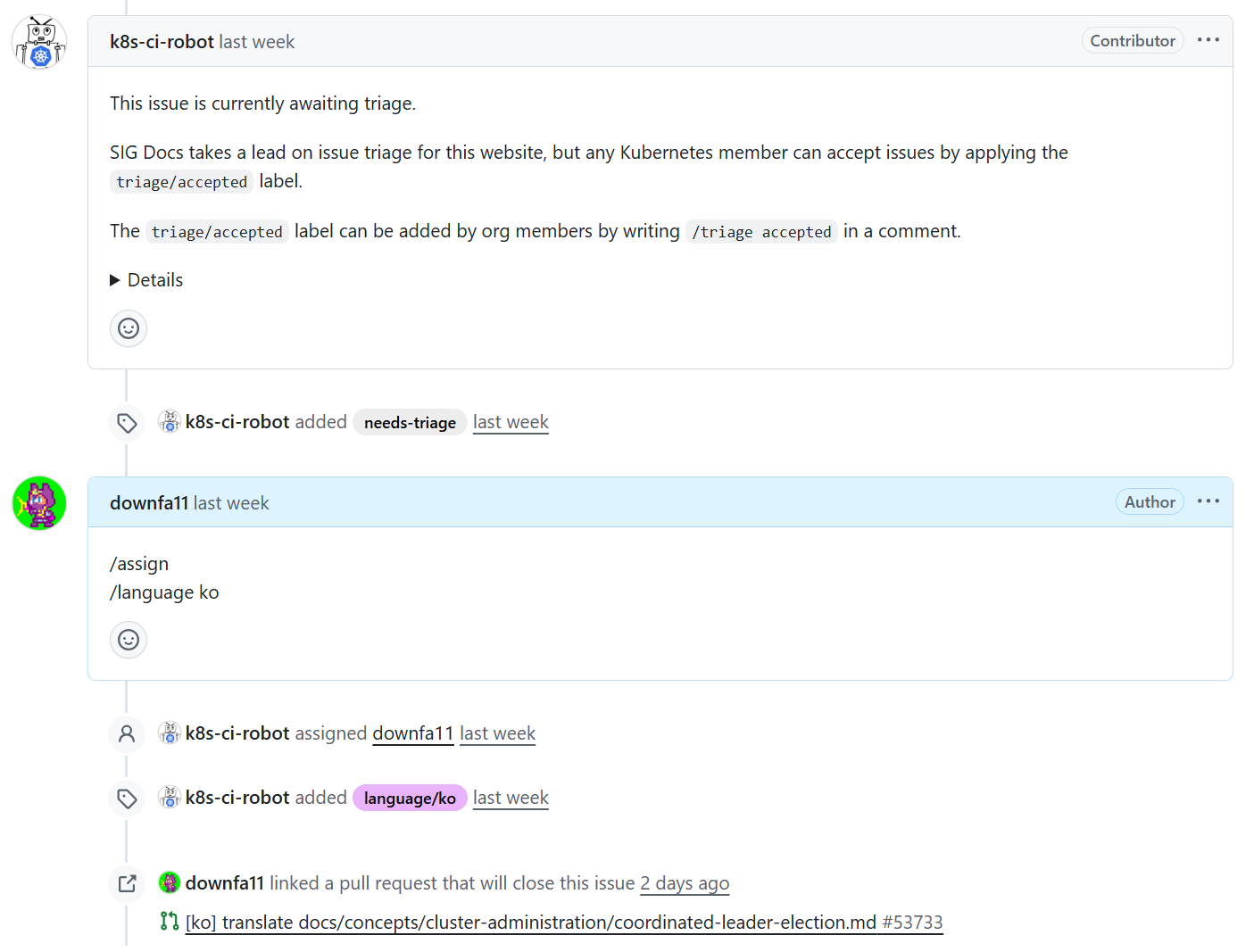 보이는 것처럼 이슈에 코멘트 형식으로 명령어를 달면 해당 문서 작업 이슈에 자신을 할당할 수 있다.