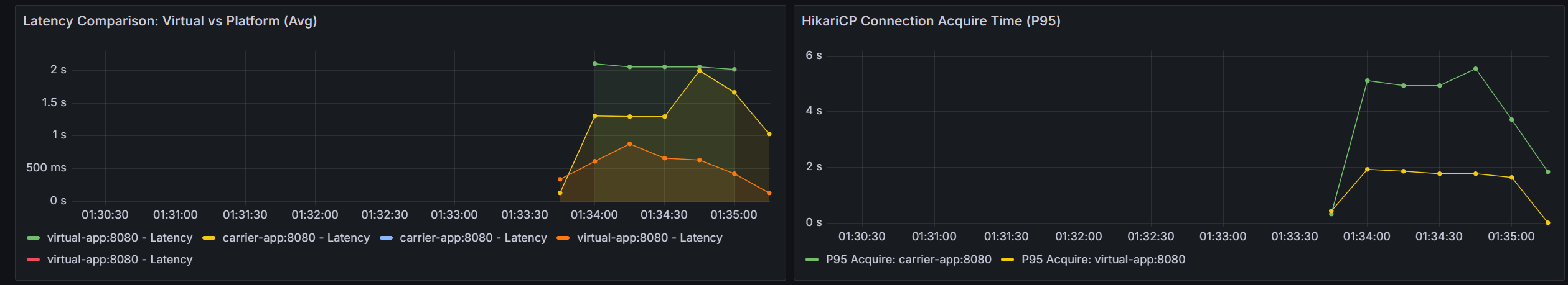 결국 성능 개선의 핵심은 가상 쓰레드 자체가 아니라, HikariCP Timeout을 통한 DB 부하 제어였다.
