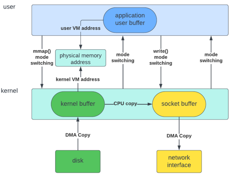 데이터를 page cache에서 socekt으로 전송하여 NIC buffer로의 복사만 이뤄진다