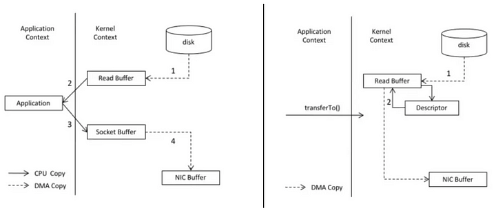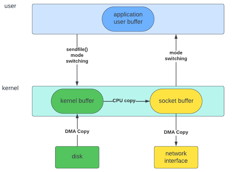 Zero Copy 원칙을 따르면, 데이터를 read buffer→socket buffer 직접 보내서 컨텍스트 스위칭이 2번밖에 없어지게 된다.