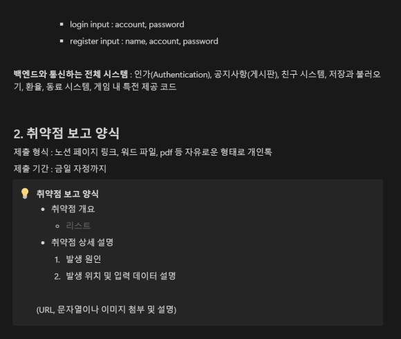 그리고 명세서나 취약점 보고 양식을 노션으로 배포해서 이벤트를 진행했다.