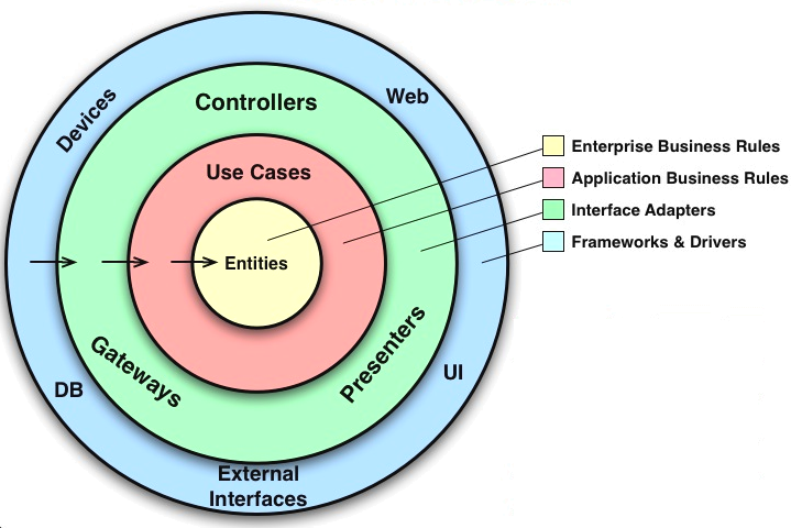Entity : 가장 내부에서 비즈니스 규칙과 애플리케이션의 핵심 로직을 정의한다.