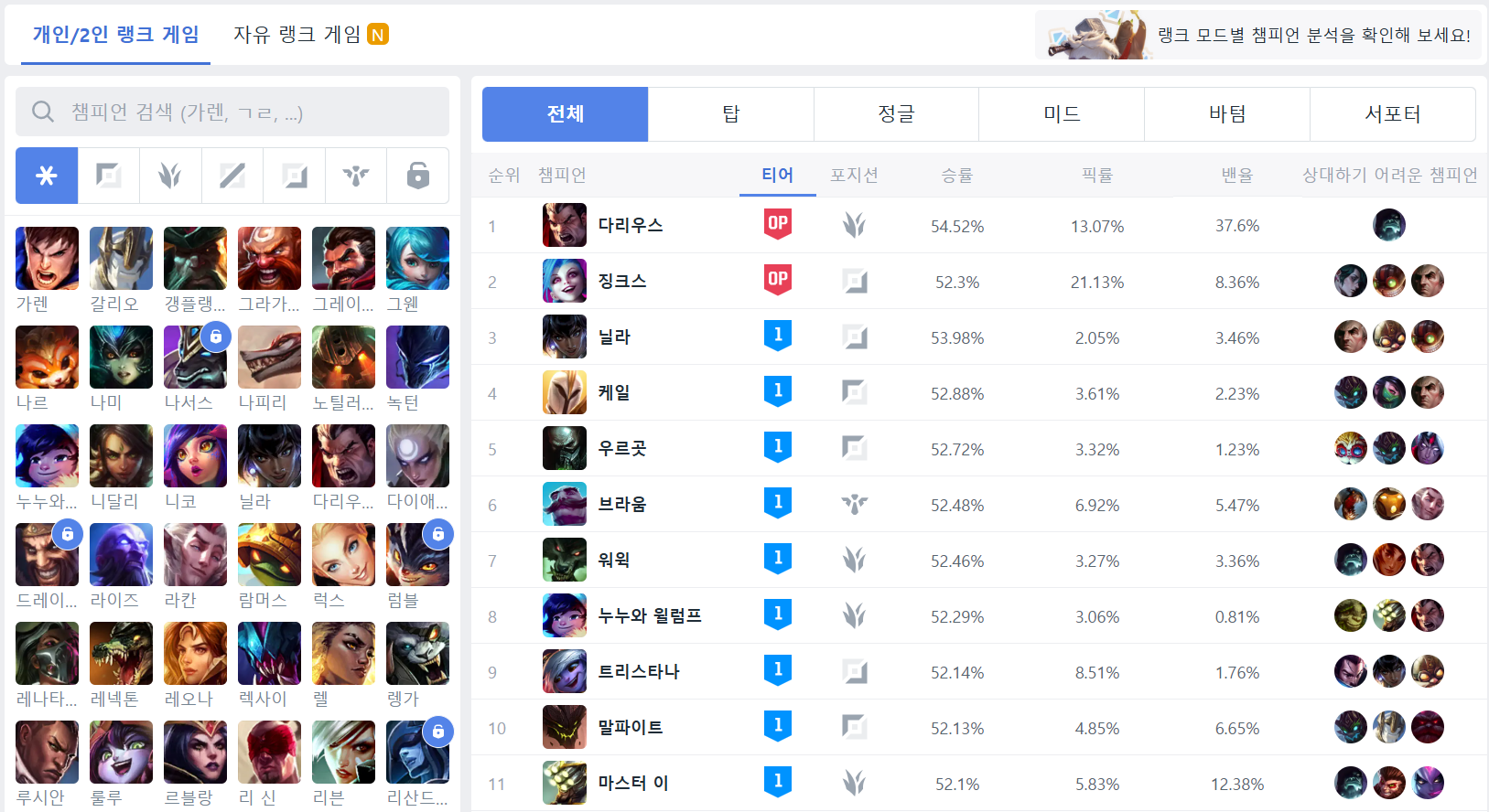 예를 들어, op.gg에서는 다음과 같이 챔피언별 통계를 제공한다.