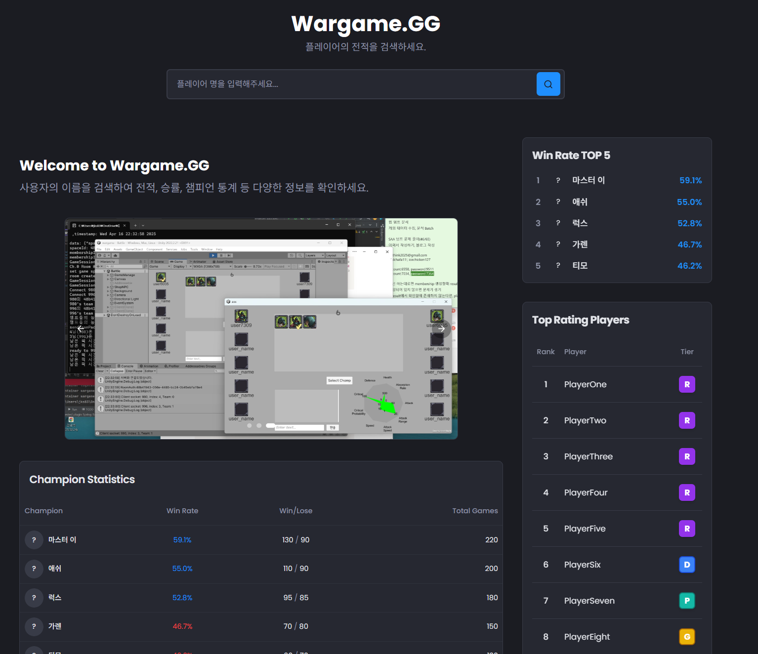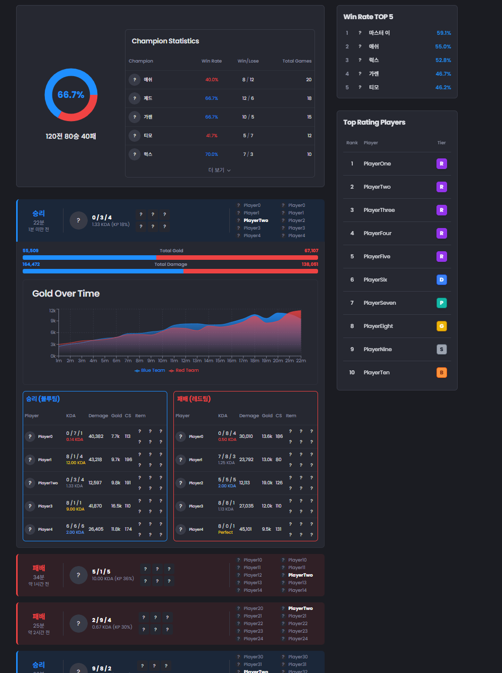 - 고정 컨텐츠: 최상위 랭커 순위, 현재 가장 승률이 높은 5개 챔프