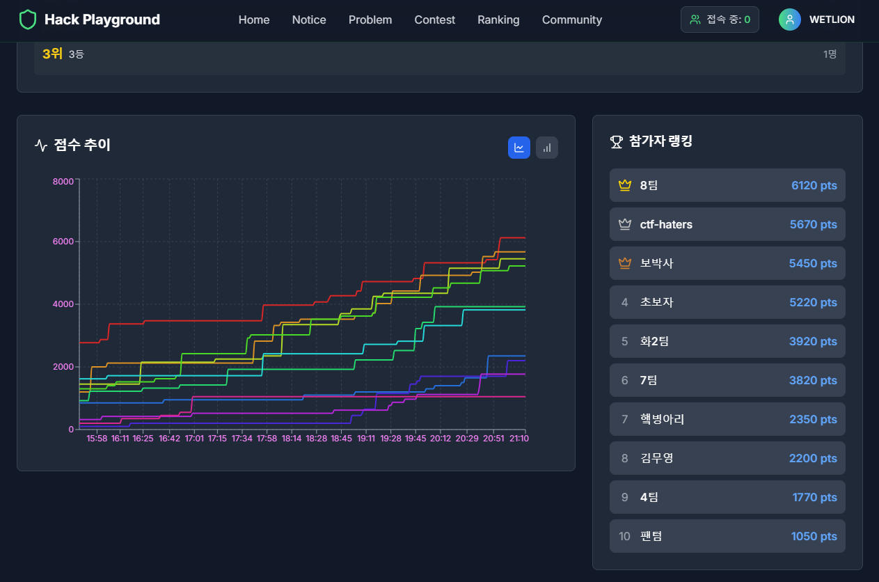 11월 8일자로 진행된 부산대-부경대 연합 해킹캠프에서 'Hack-Playground' 서비스 내의 CTF 대회를 시범적으로 도입했다. 서비스 자체는 KOREN망 안에서 호화롭게 실험하고 성능 걱정없이 트래픽 때려박던 공모전 기간이 끝나면서, 초라한 운영 서버로 겨우 무료로 연명하고 있었다. 1. 학술 행사에서의 서비스 실사용부산대와 부경대 정보보안 동아리끼리 문제를 제작했고, 해운대에 위치한 동남정보보호클러스터의 훈련장을 지원받아서 오프라인으로 행사를 진행했다. 12시부터 오프라인으로 대회장에 모여서 회원가입 및 소속을 등록하는 참가 수속을 진행하고, 13시부터 CTF 대회를 진행했다. 최대 5명까지 팀을 생성 혹은 참가해서 경쟁하는 구조인데, 무려 8시간 넘게 진행되기에 색다른 트래픽 경험이 될거라..