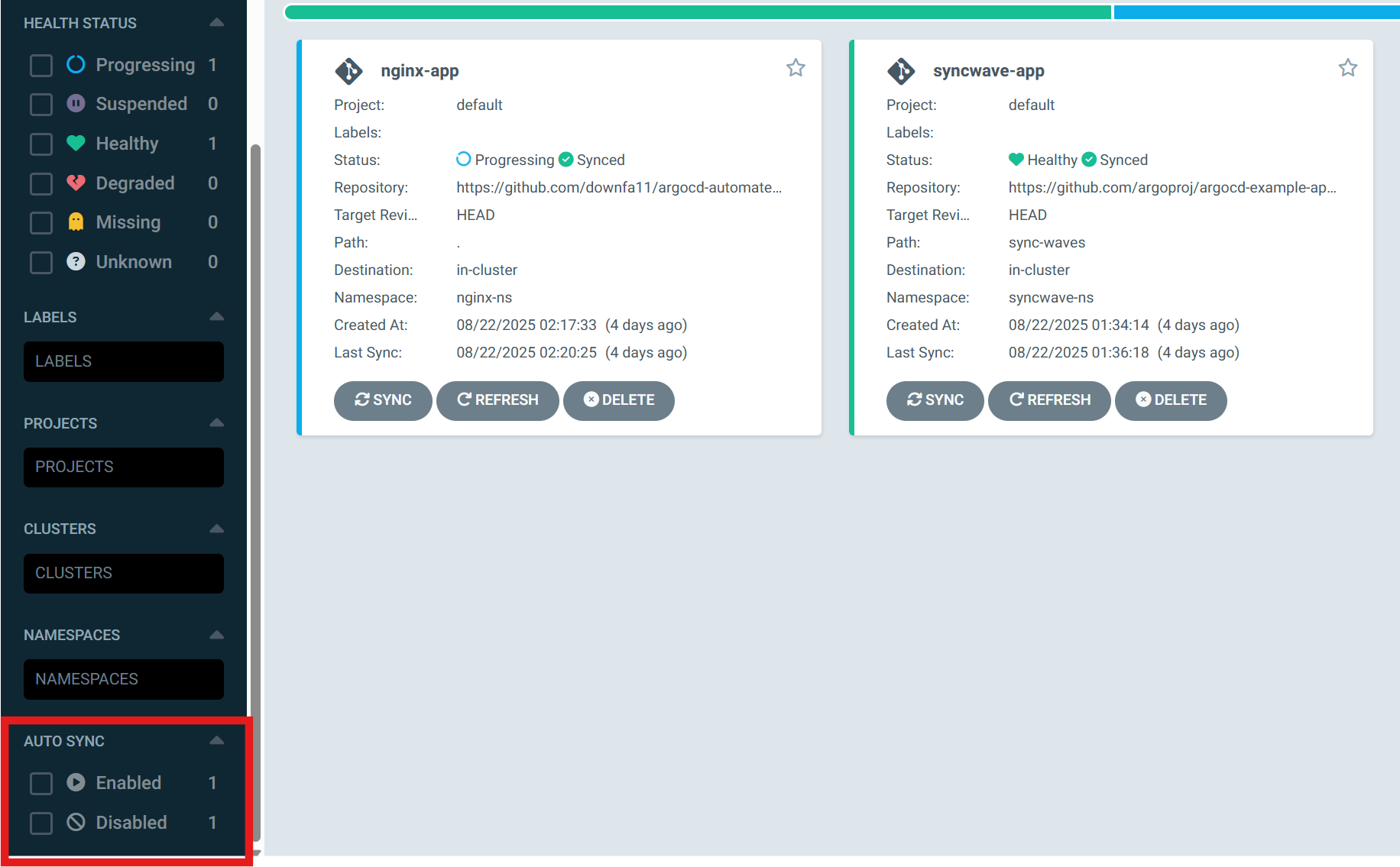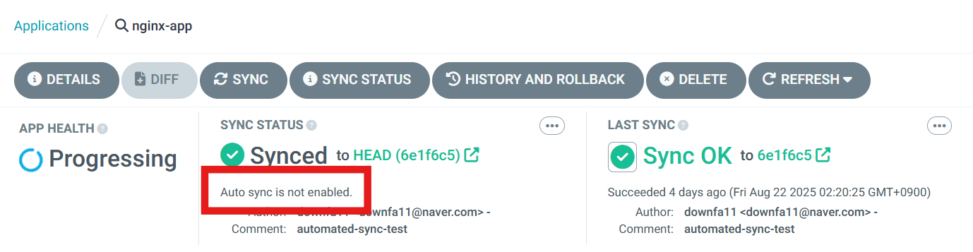 그래서 그냥 시작했다. 근데 재현해보니 argocd cli에서도 동작안하고 Web UI에서도 'auto-sync is enabled'로 떴다.