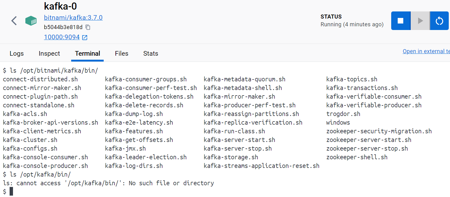 *.sh 파일들은 컨테이너 내부의 /opt/bitnami/kafka/bin/ 혹은 /opt/kafka/bin/ 디렉토리에서 찾을 수 있다.